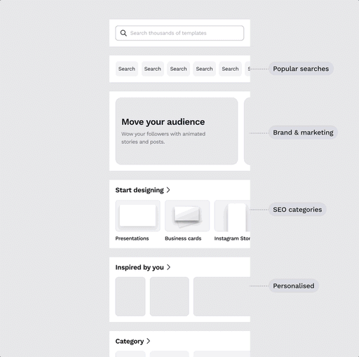 This added pressure stalled growth for one of Canva's most important growth channels. Many users were confused about the design categories Canva offered, and a significant proportion didn’t explore our template library when creating new designs—missing out on one of Canva’s most valuable propositions!