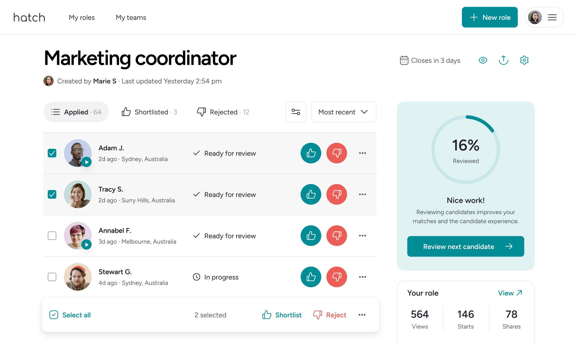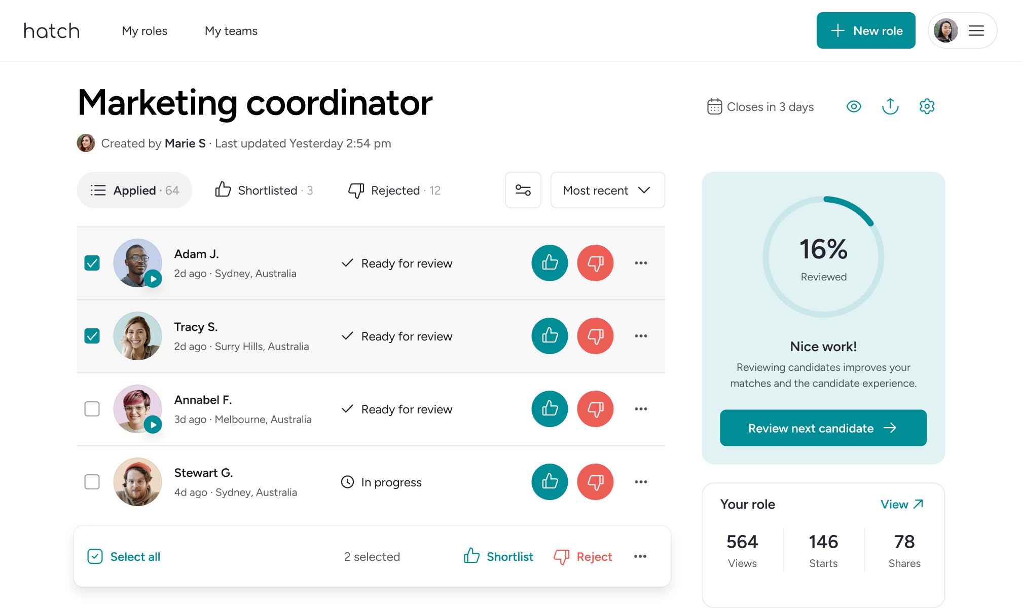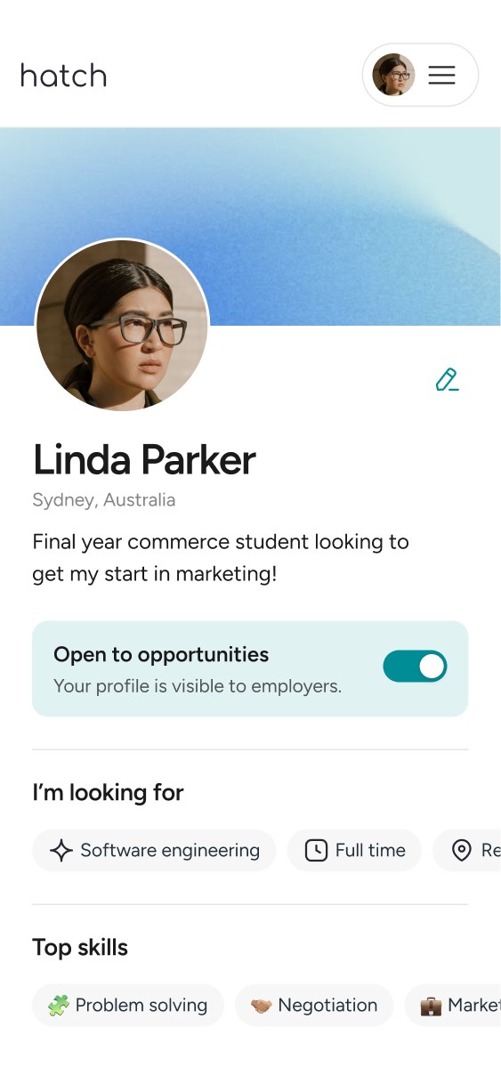 Hatch is more than a job board. It's where emerging professionals go to discover high-impact roles with Sydney's fastest-growing tech companies. Candidates and employers love it because they can go beyond the resume and get matched with people who share the same values and working style.